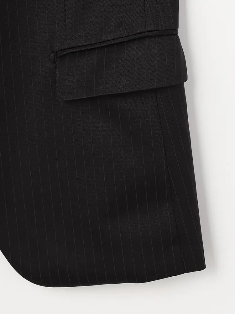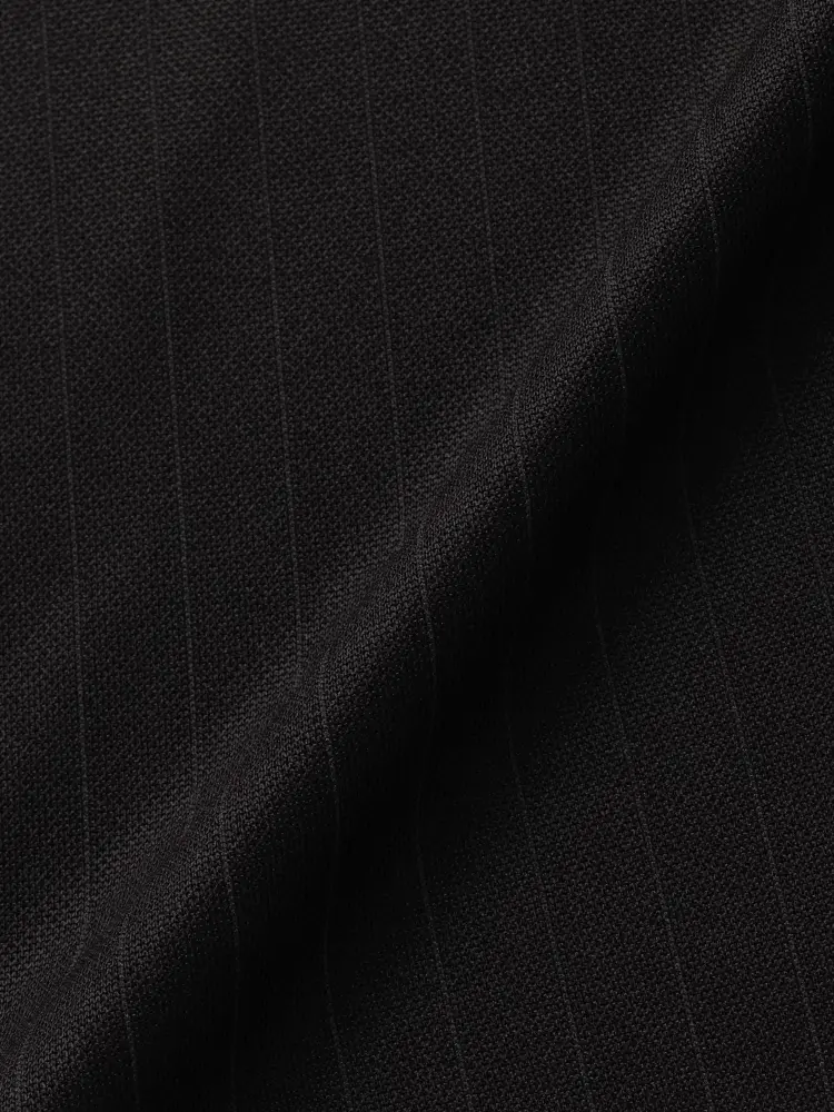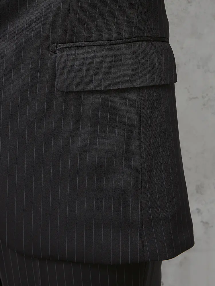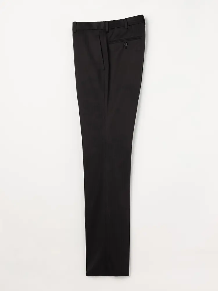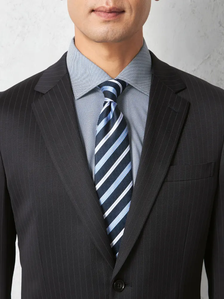 繊細なストライプが着こなしを引き締めるセンターベントのノータックスーツ。