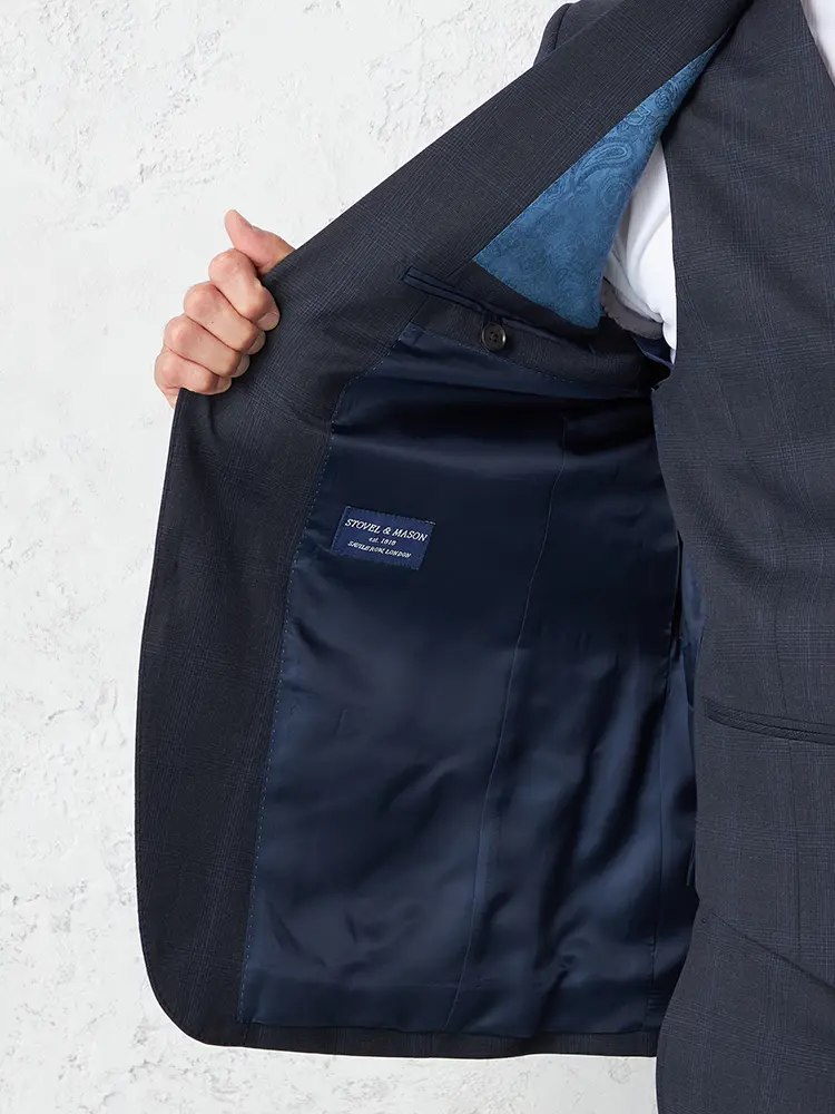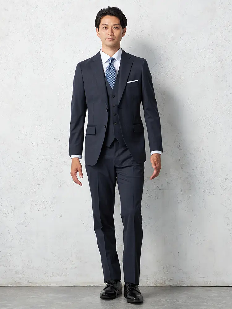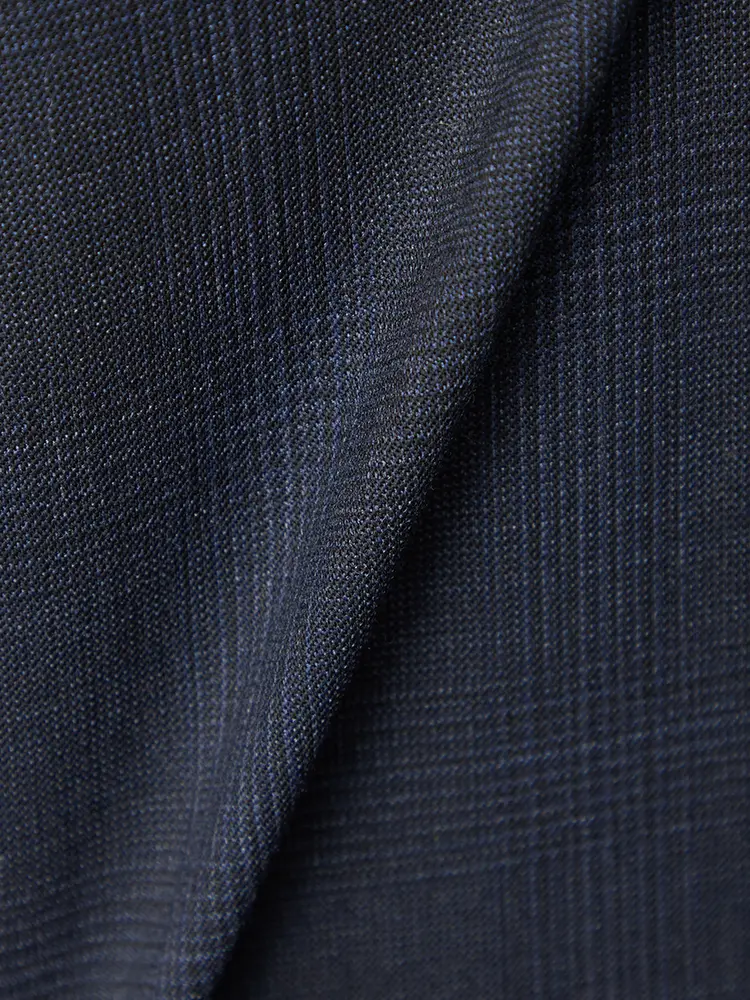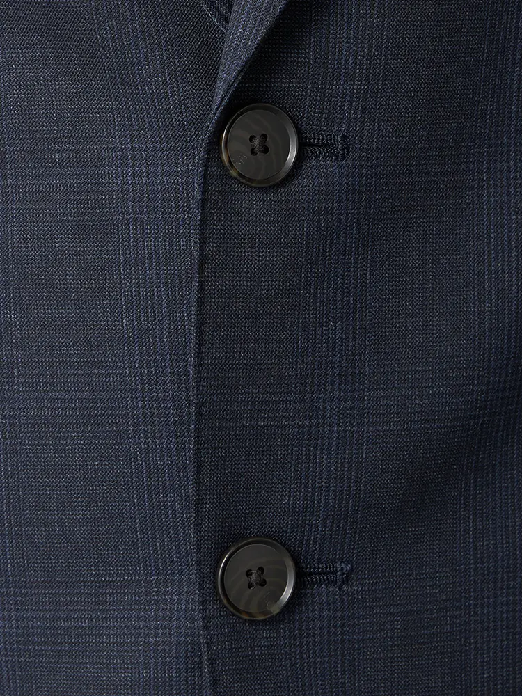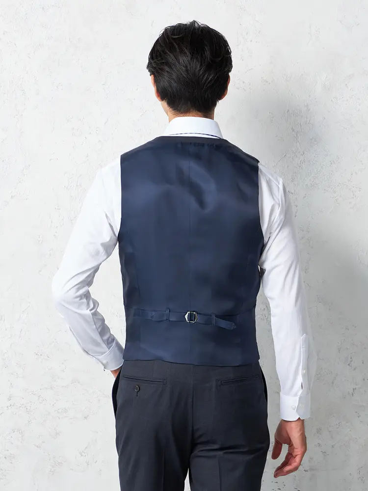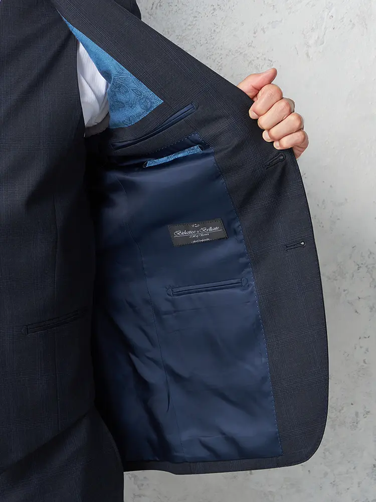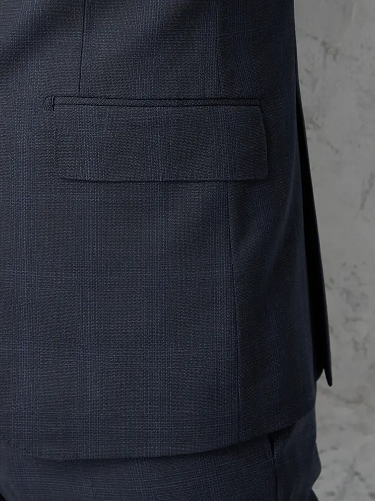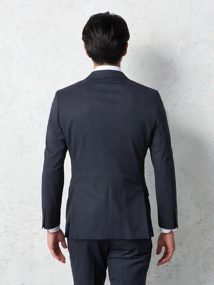 サイドベンツ背抜き仕立て仕様のチェック柄スリーピーススーツ。