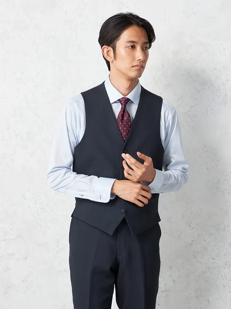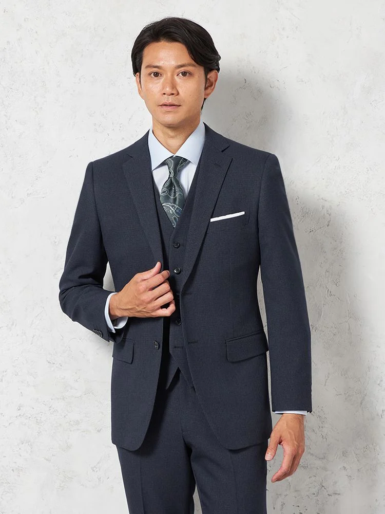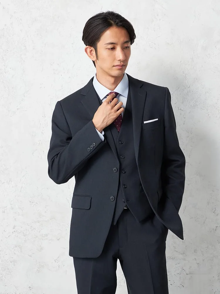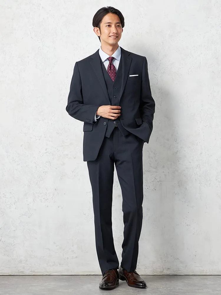ビジネスシーンでもオケージョンでも活躍するネイビーの無地のスリーピーススーツ