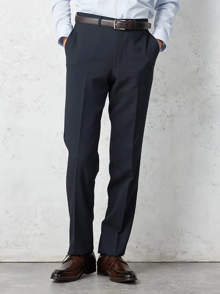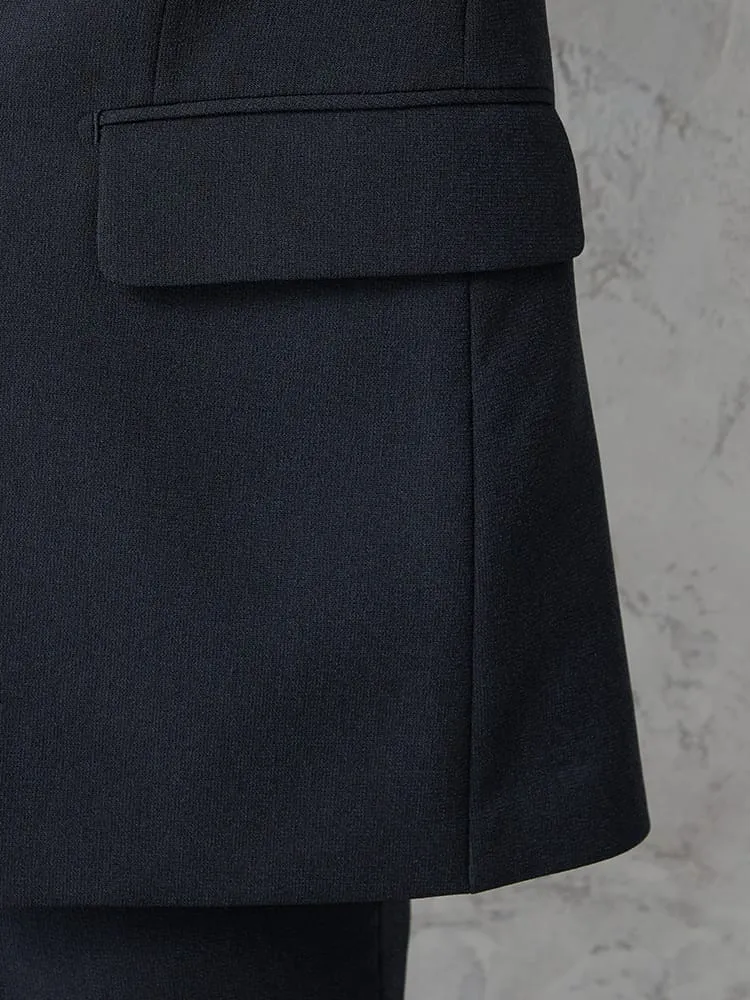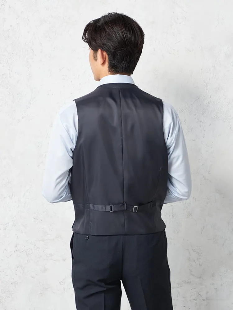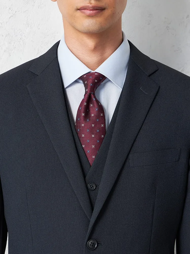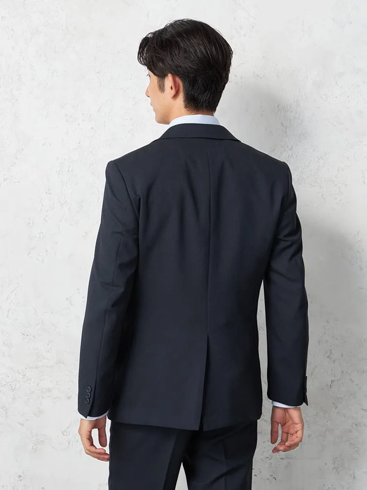 ビジネスシーンでもオケージョンでも活躍するネイビーの無地のスリーピーススーツ