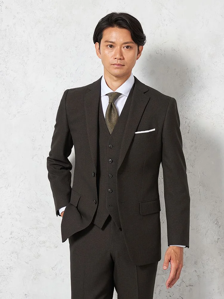 【即納】スリーピーススーツ2つボタン【WEB限定】ウールライク小柄ブラウン秋冬