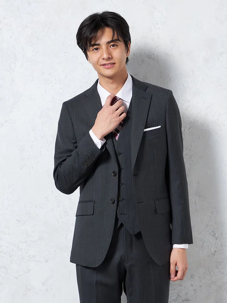 ベストが付いた3ピース仕様で、様々な着こなしをお楽しみいただけます。