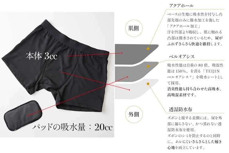 パンツの生地だけでも3ccの吸水力、パッドなしでもチョイ漏れ対策として対応可能。