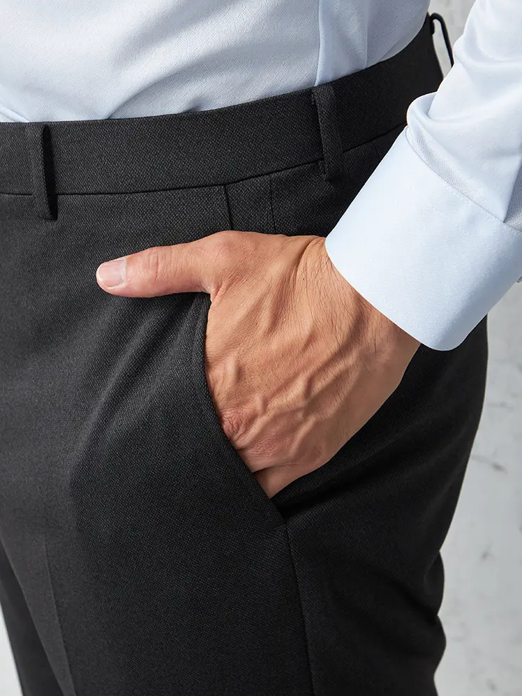 センタープレスや両玉縁のヒップポケットのキレイ目感も特徴。