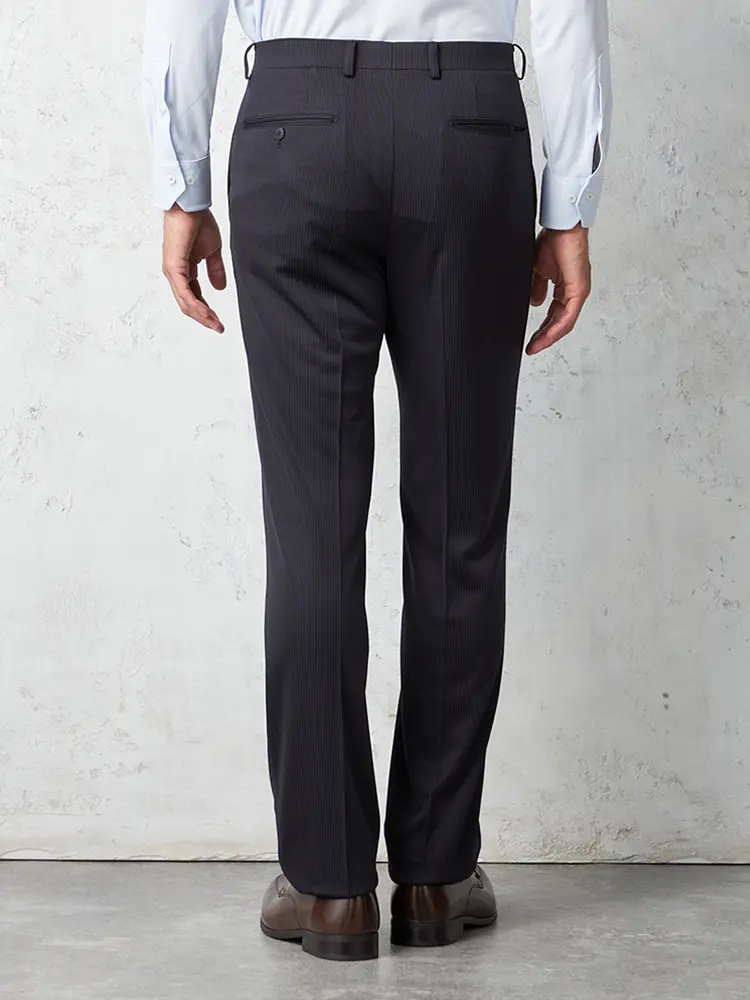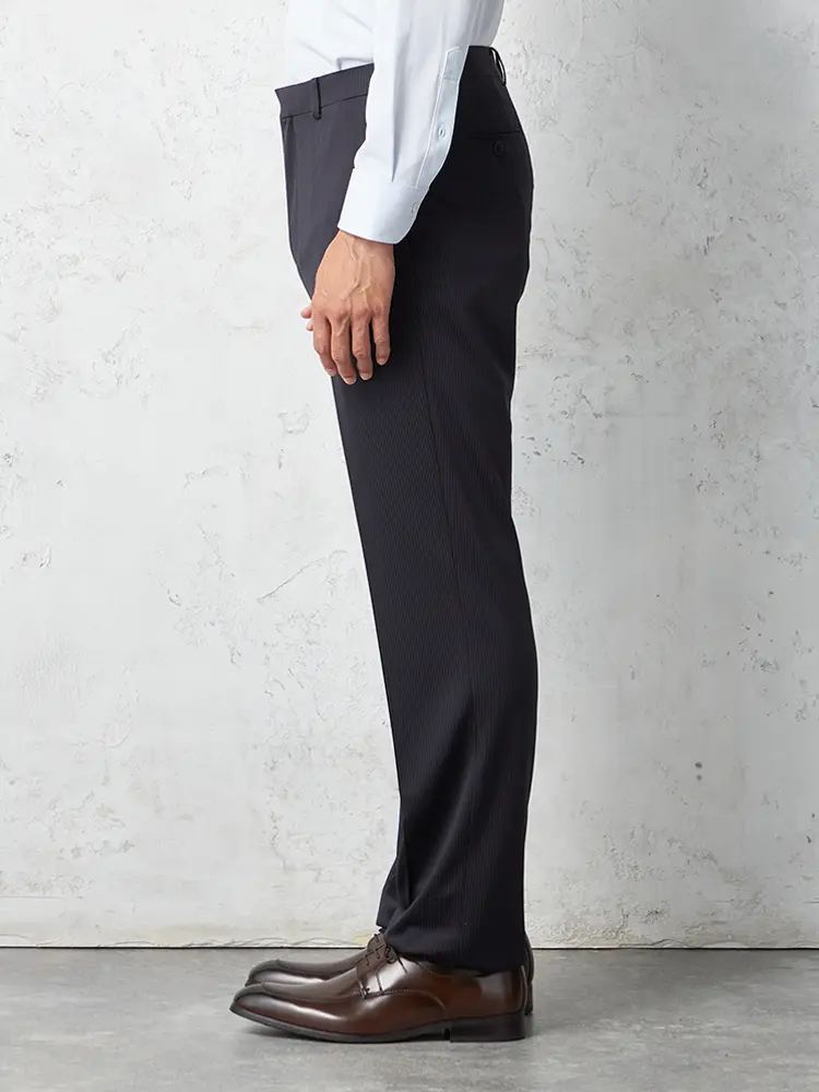 ノータックの腰回りに細ストライプの柄で、スマートな印象に穿きこなせるニット素材のウォッシャブル仕様のパンツ。