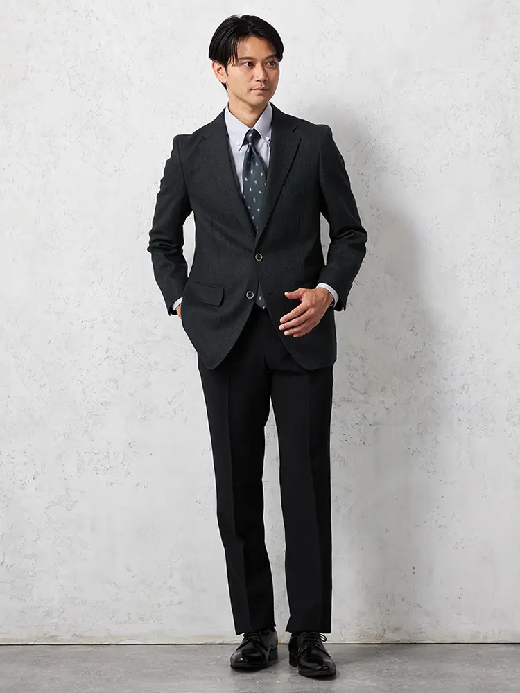 あわせるシャツやネクタイを選ばない、同素材のジャケットとのセットアップがおすすめです。