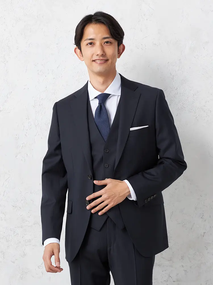高品質ウール混素材を使用した、フレッシャーズ向けスリーピーススーツ。