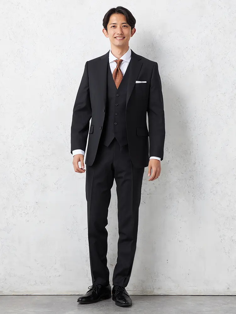 ジャケット、パンツ、ベストの3点セットで、スーツ全体を簡単にコーディネートできます。ビジネスやフォーマルな場面に最適です。