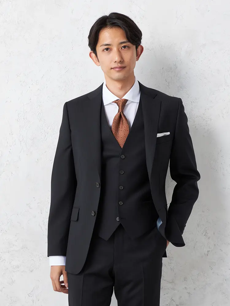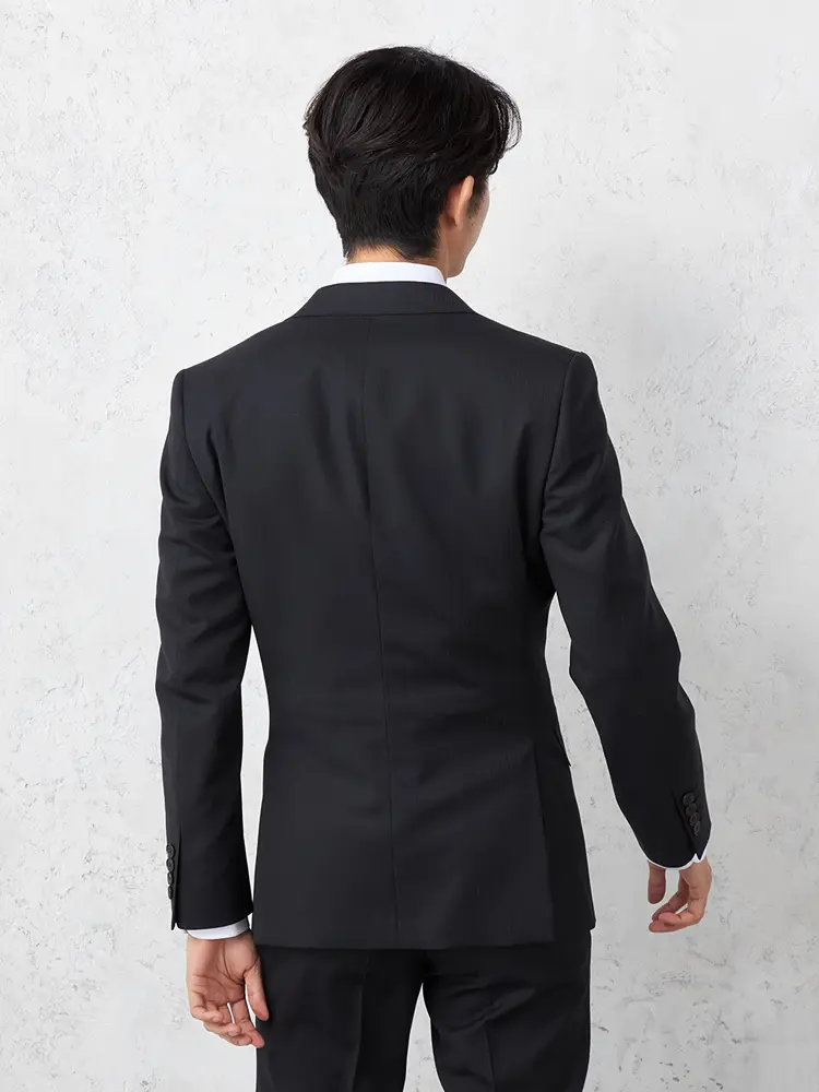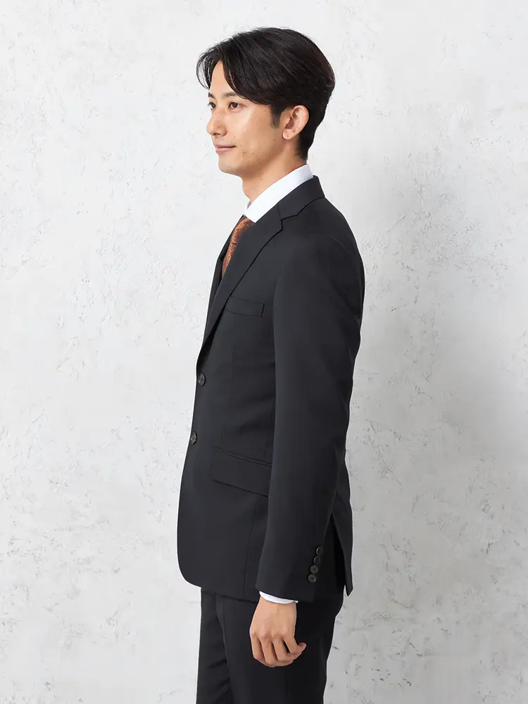 背抜き仕立てとサイドベンツで動きやすく、パンツは美脚に見えるノータック仕様。