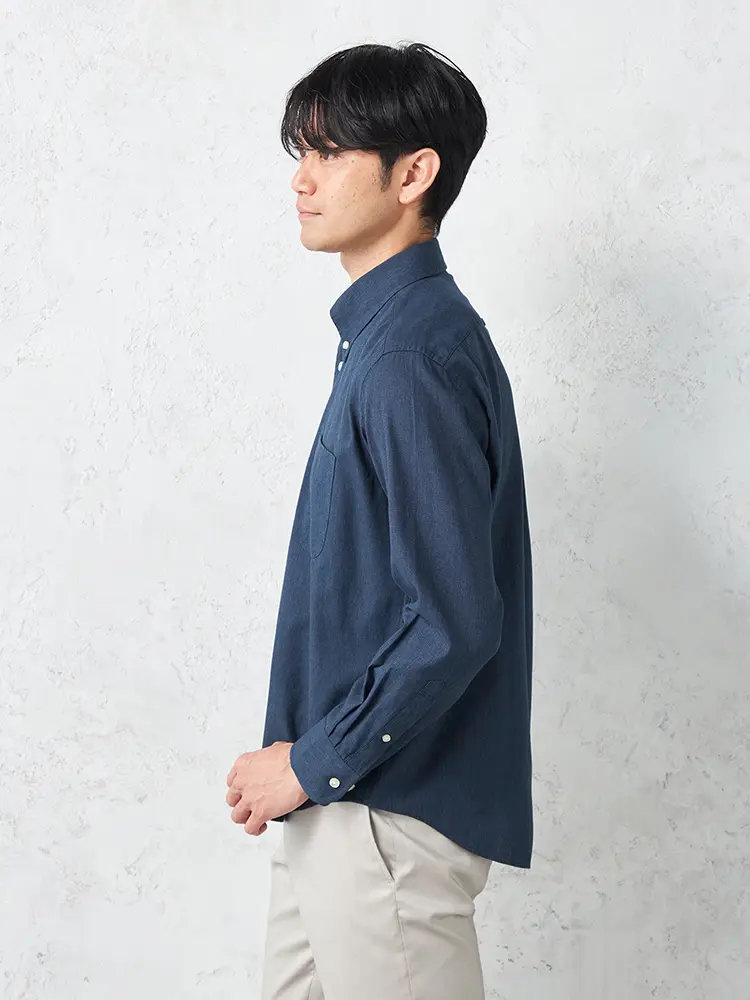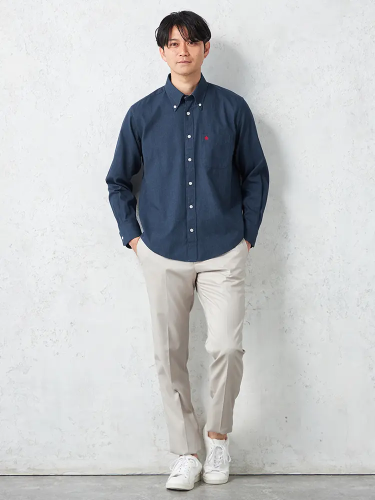 ボタンダウンのデザインが程よいきちんと感を出し、幅広いシーンでキレイ目なカジュアルスタイルを楽しめる一着です。