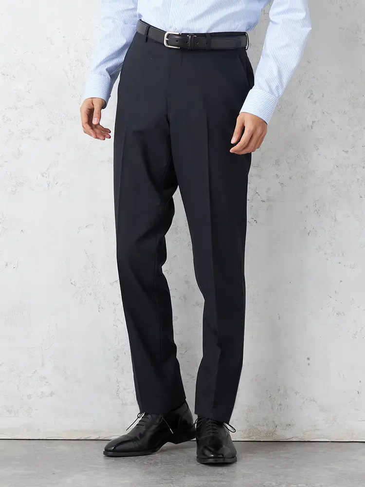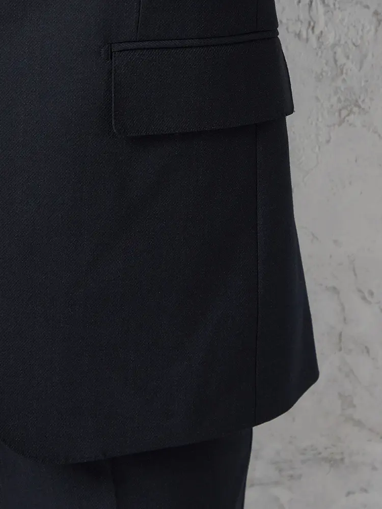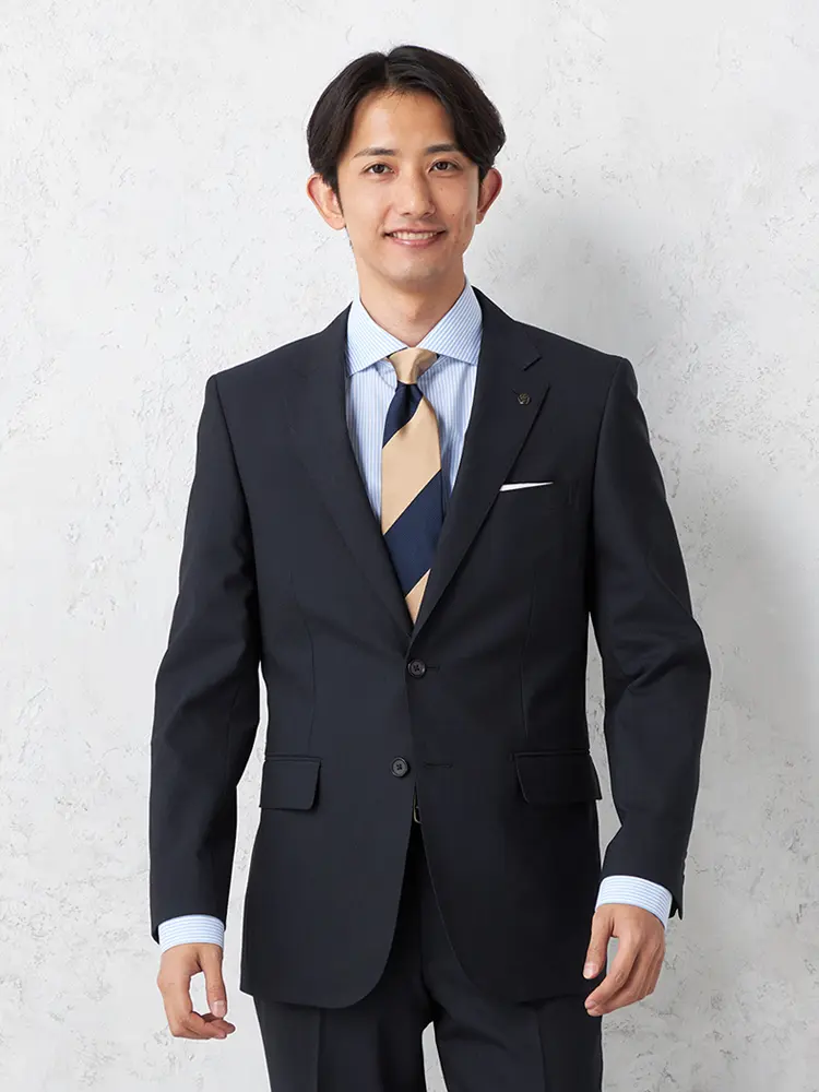 ビジネスやセレモニーに重宝するブラック無地スーツ。