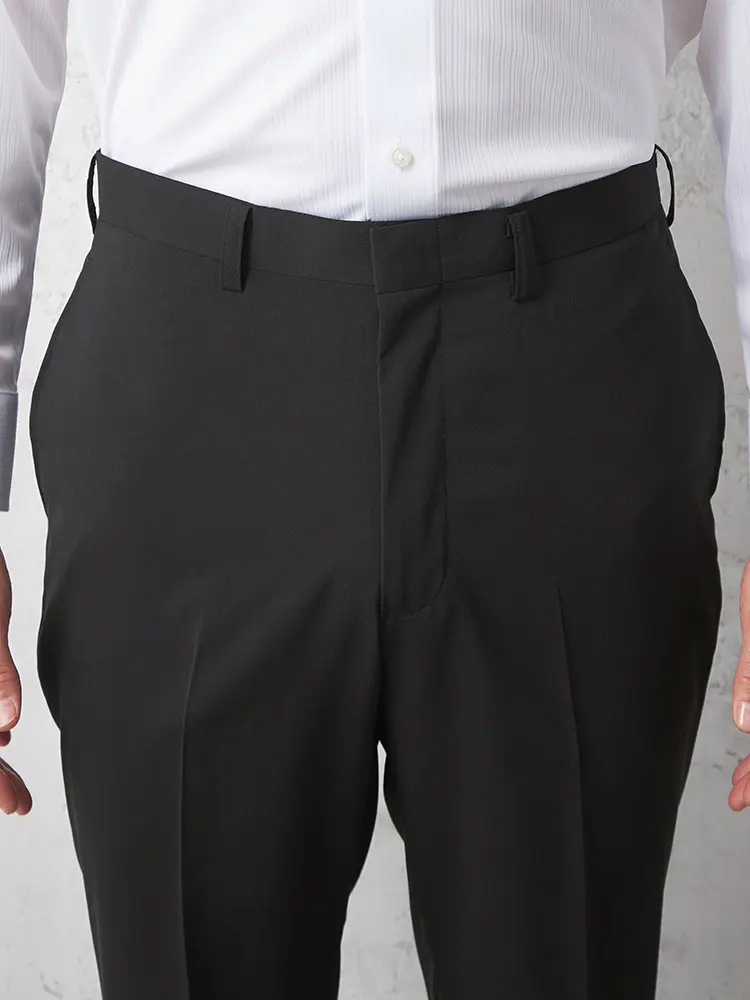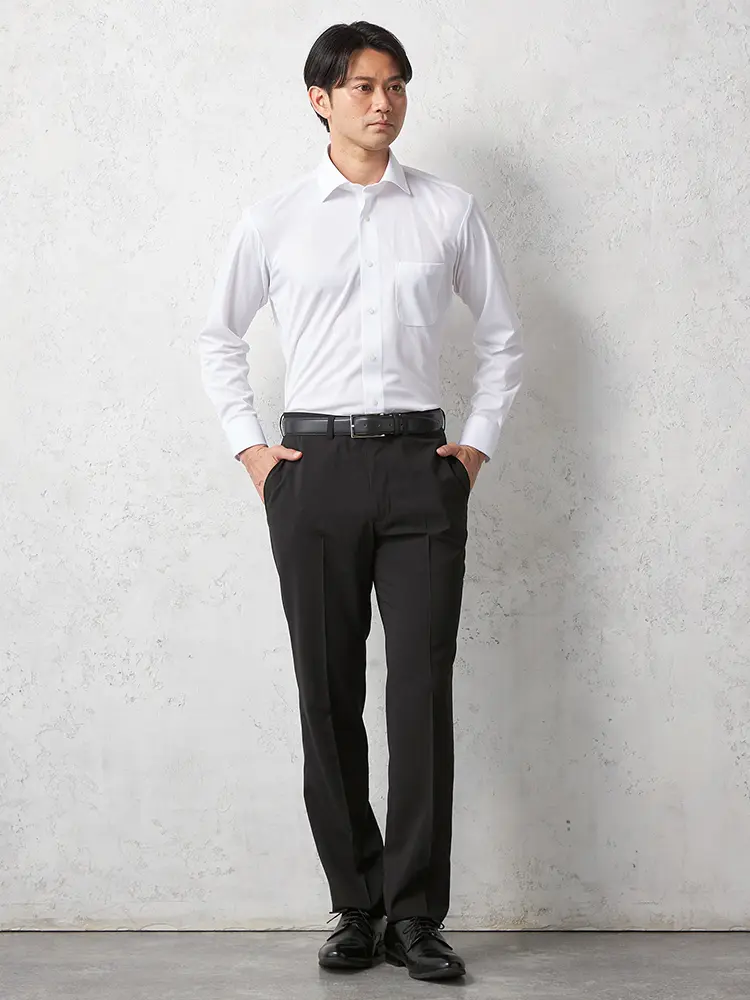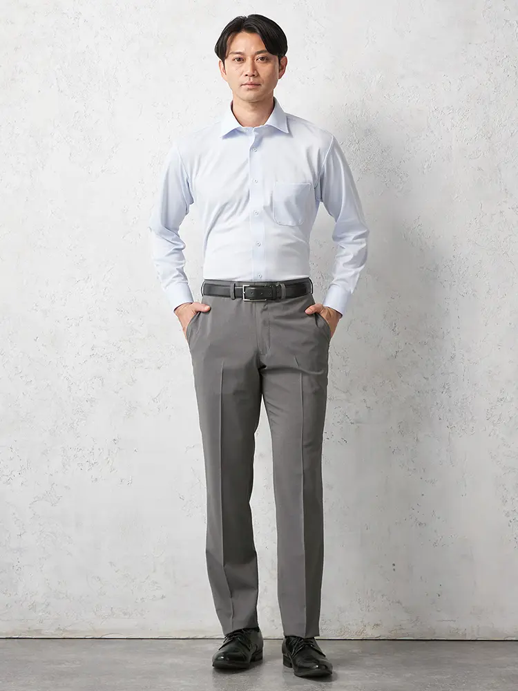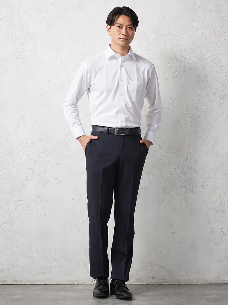 腰回りがすっきり見える定番のノータックシルエットが、足元をスマートに引き立てます。