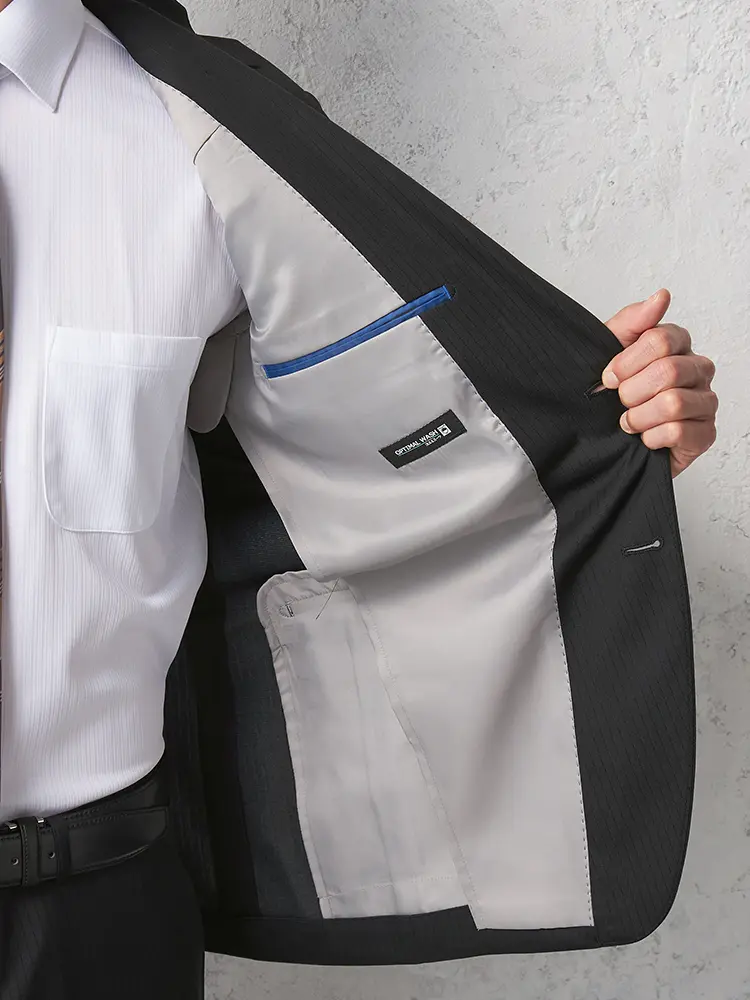 半裏仕様とセンターベントで動きやすく、上下ともに家庭で洗えるウォッシャブル仕様。
